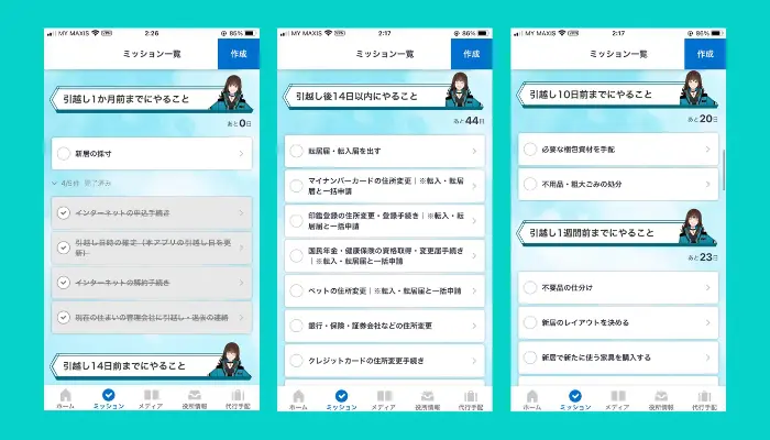 - 引越しタスクを自動生成:9つの質問に答えるだけで、自分に合った約60個のミッションが作成される。やるべきことが一目で分かるので迷いません。