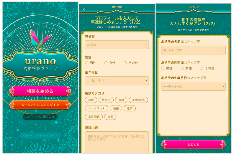 「ウラーノ」は、電話番号やメールアドレスの入力なしで始められるため、
